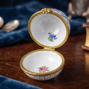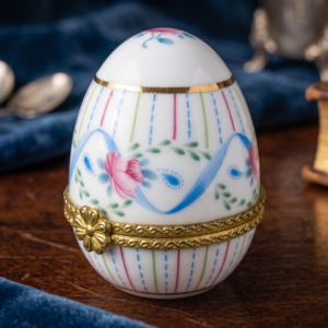 This antique-style porcelain egg is a refined decorative piece designed to bring a touch of classic elegance to any interior. Crafted from smooth glazed porcelain, it features soft pastel striping, hand-finished floral motifs, and an ornate gold-tone band that opens to reveal a small interior compartment.