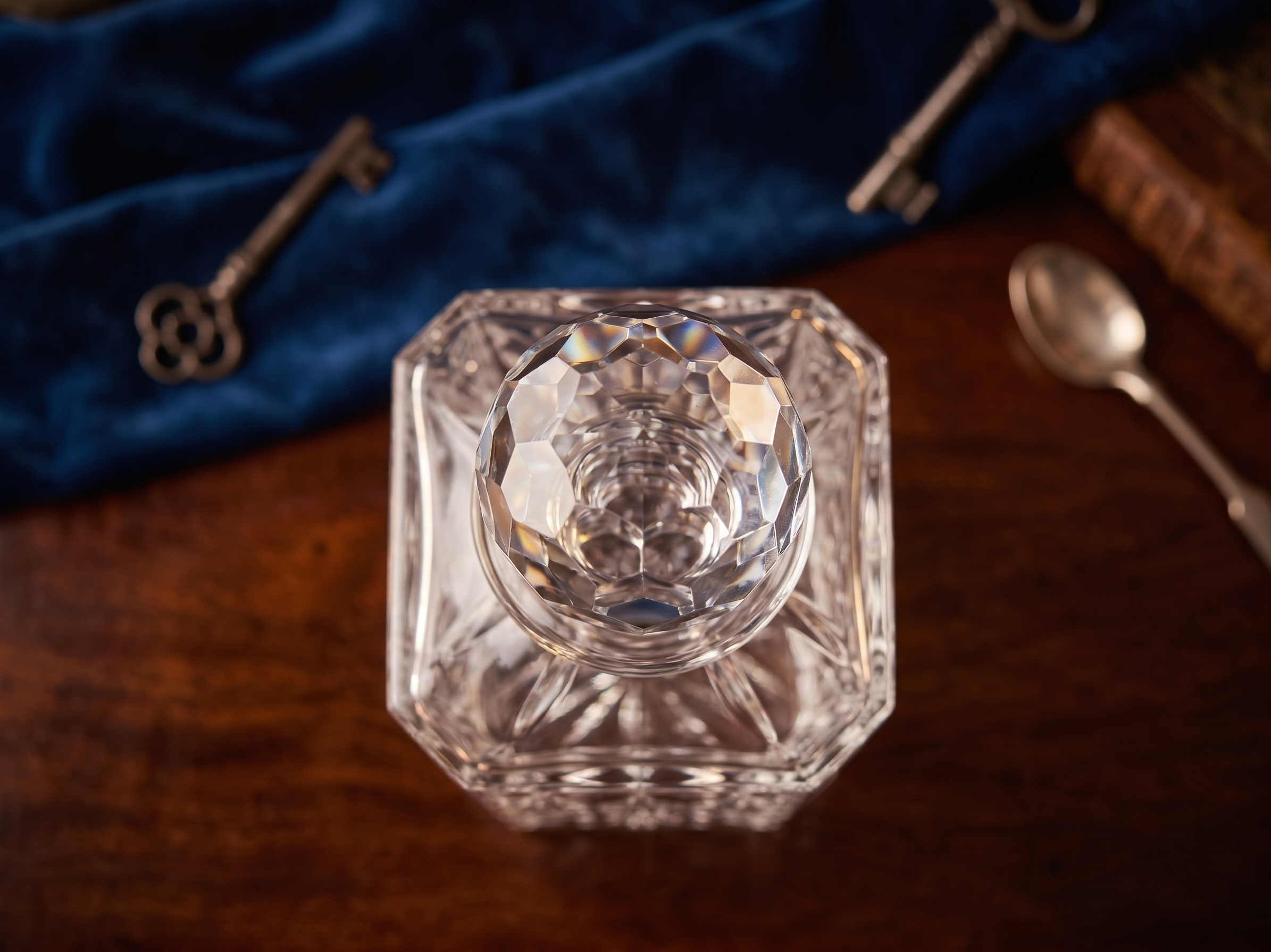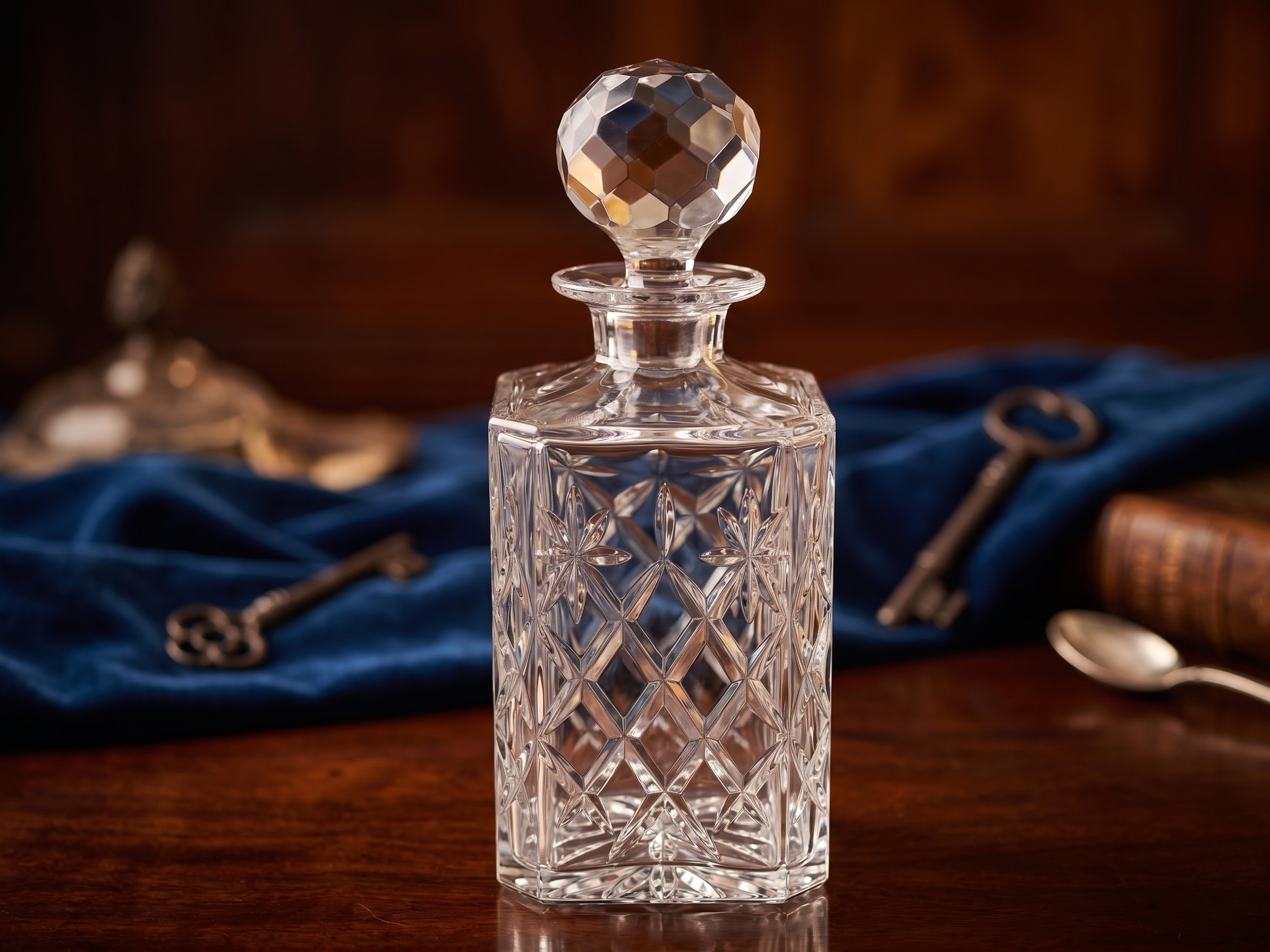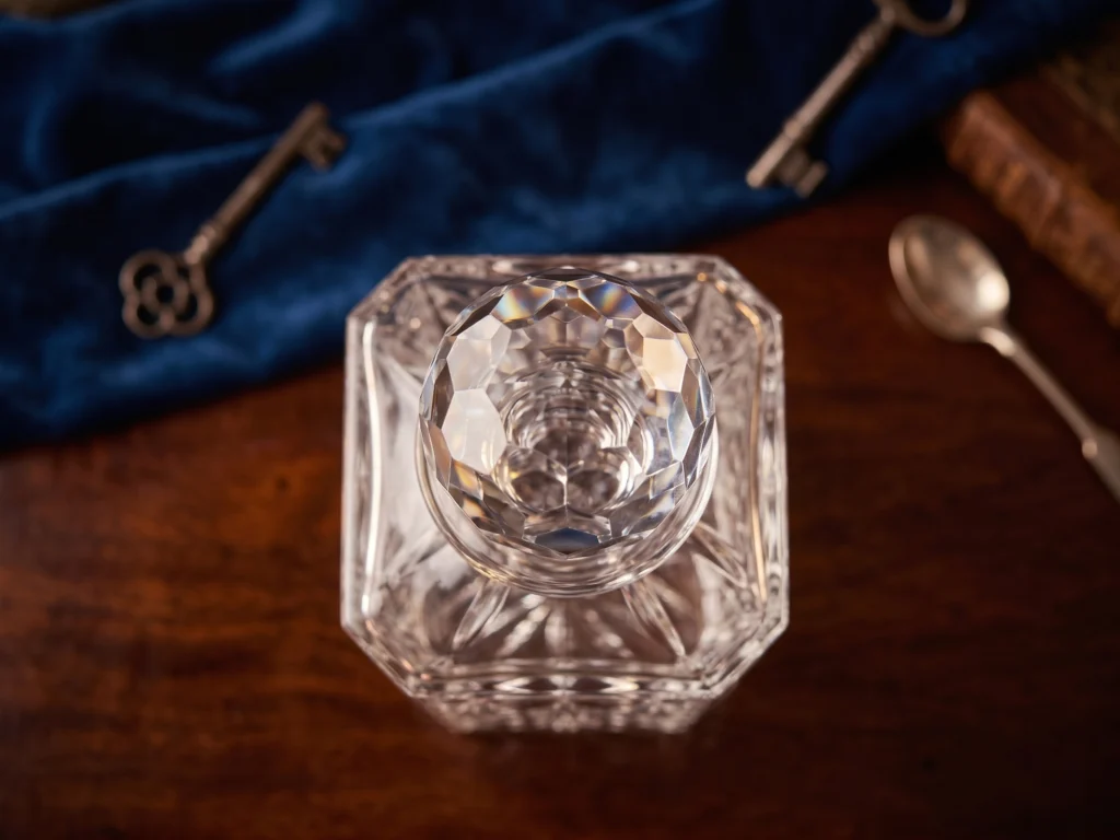 This vintage cut crystal square decanter, featuring a faceted stopper, showcases the craftsmanship of fine glassmaking. Its intricate criss-cross cuts and geometric design reflect light beautifully, a hallmark of quality crystal.