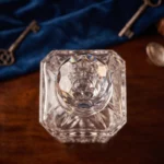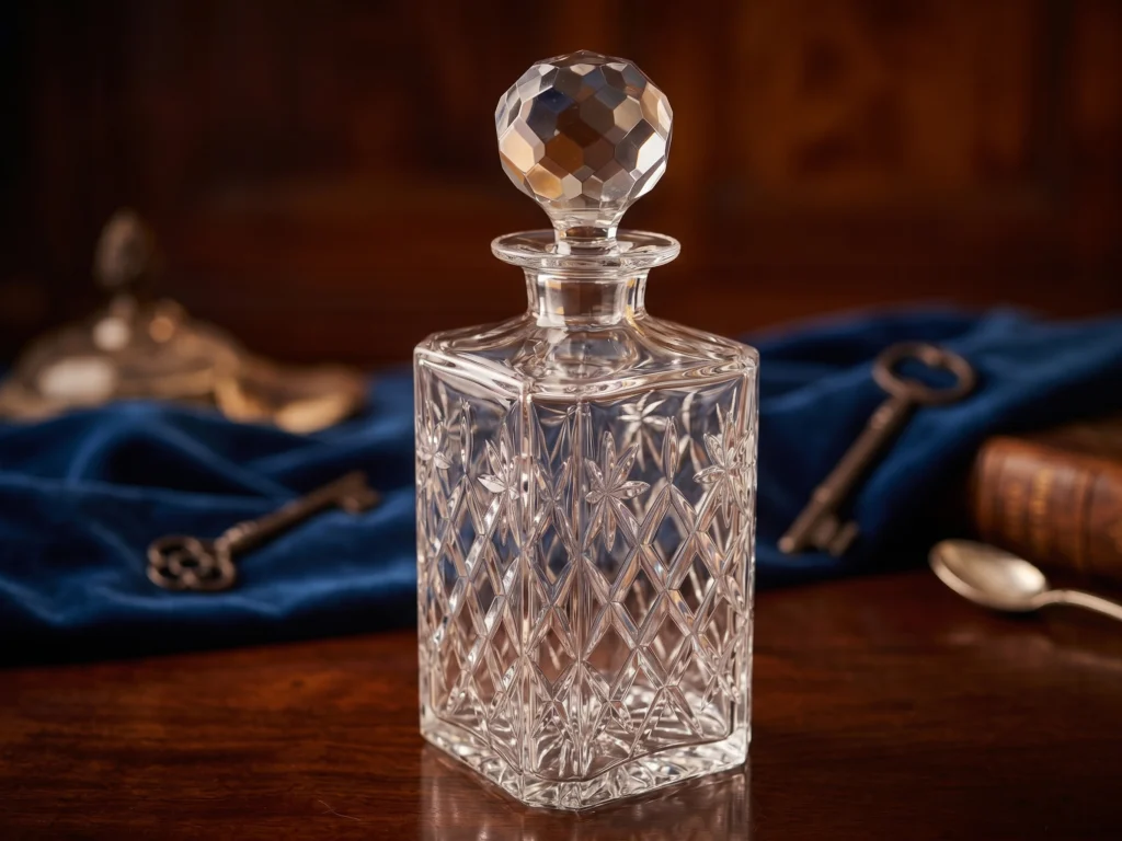 These decanters were popular during the mid-20th century, adding a touch of elegance to home bars. Collectors appreciate their aesthetic appeal and functional use, making them a desirable addition to any collection. The square shape and detailed stopper enhance its visual appeal and value.